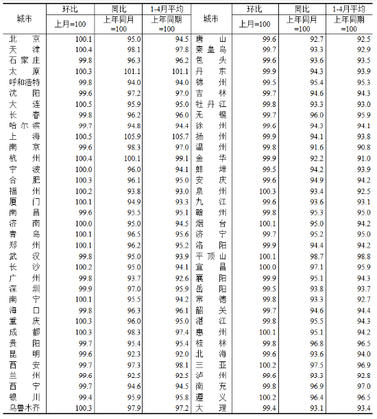 各线城市商品住宅销售价格同比降幅均持续收窄。4月份,一线城市新建商品住宅销售价格同比下降2.1%,降幅比上月收窄0.7个百分点。其中,上海上涨5.9%,北京、广州和深圳分别下降5.0%、6.3%和3.0%。二、三线城市新建商品住宅销售价格同比分别下降3.9%和5.4%,降幅分别收窄0.5个和0.3个百分点。4月份,一线城市二手住宅销售价格同比下降3.2%,降幅比上月收窄0.9个百分点。其中,北京、上海、广州和深圳分别下降1.0%、0.6%、7.4%和3.7%。二、三线城市二手住宅销售价格同比分别下降6.5%和7.4%,降幅分别收窄0.5个和0.4个百分点。