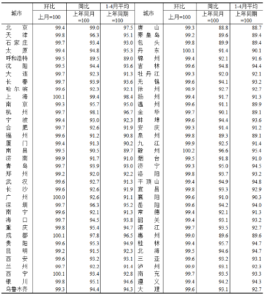 各线城市商品住宅销售价格环比持平或略降。4月份,一线城市新建商品住宅销售价格环比由上月上涨0.1%转为持平。其中,北京和上海分别上涨0.1%和0.5%,广州和深圳分别下降0.2%和0.1%。二线城市新建商品住宅销售价格环比持平,与上月相同。三线城市新建商品住宅销售价格环比下降0.2%,降幅与上月相同。4月份,一线城市二手住宅销售价格环比由上月上涨0.2%转为下降0.2%。其中上海上涨0.1%,广州持平,北京和深圳分别下降0.6%和0.3%。二、三线城市二手住宅销售价格环比均下降0.4%,降幅比上月分别扩大0.2个和0.1个百分点。